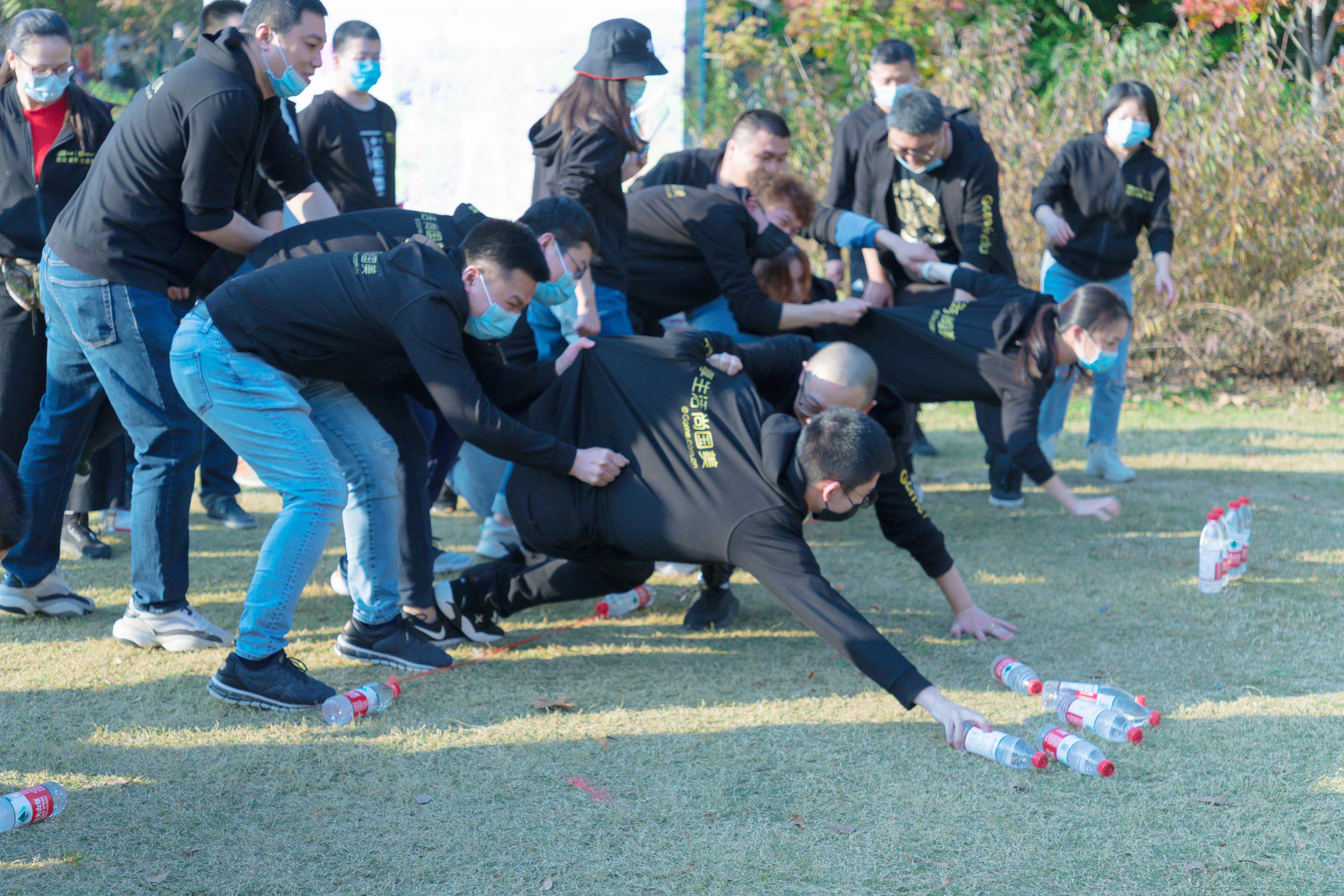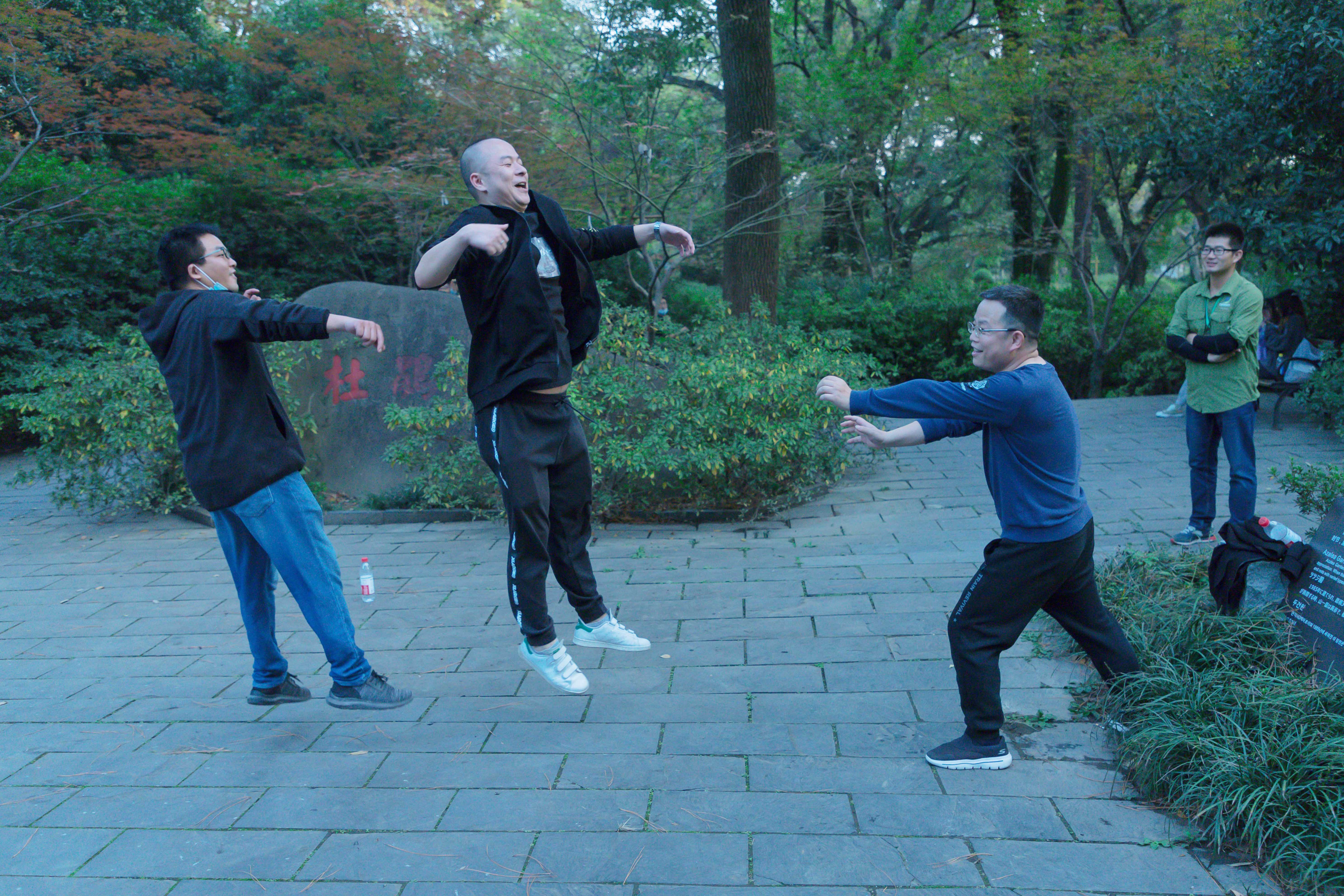 要求雙腳離地,并擺出隔山打牛的姿勢進行定格打卡拍照.
