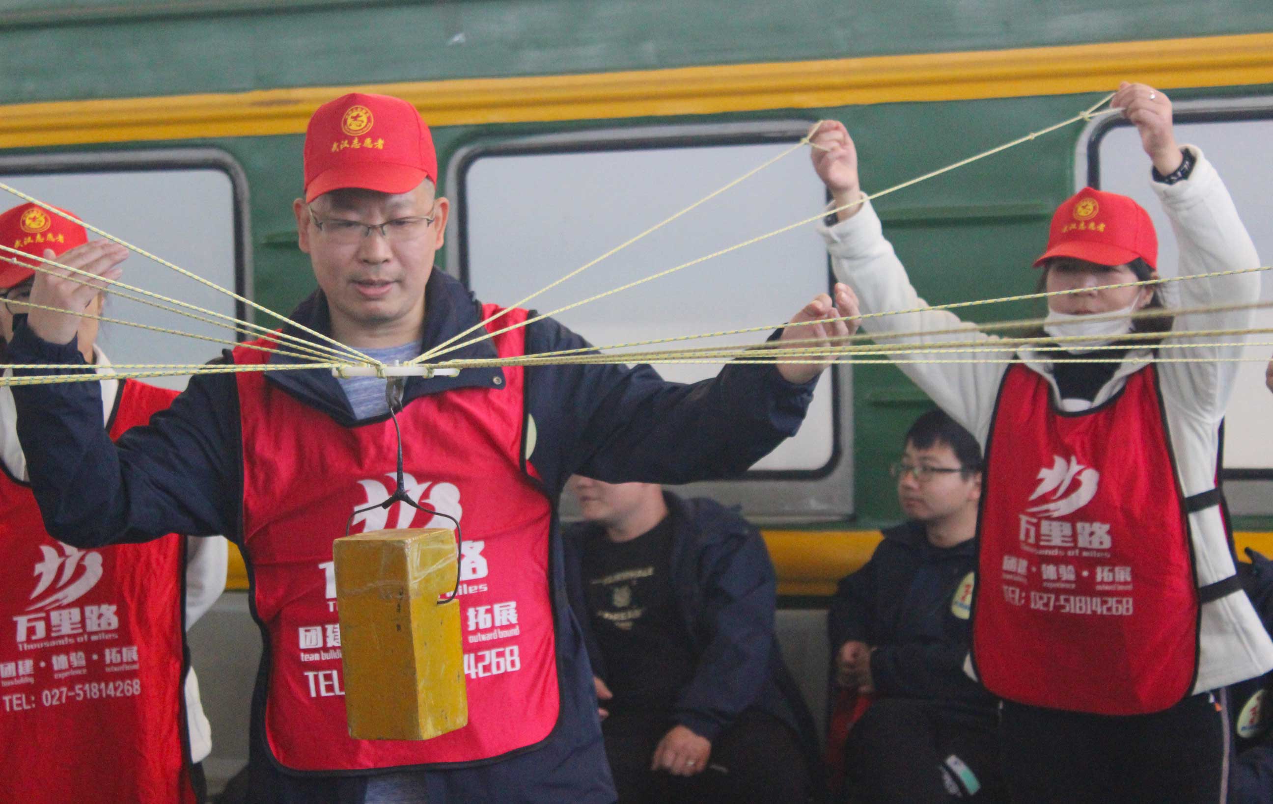 團(tuán)隊(duì)成員手拉繩子,通過(guò)配合協(xié)作