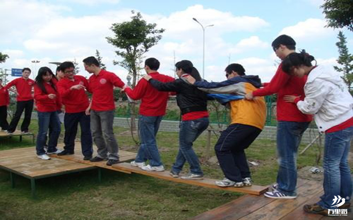 每兩人齊腰握住一木棒組成云梯,隨著隊員一個個爬過云梯的流動帶動整個云梯的前進(jìn),從起點到達(dá)終點。