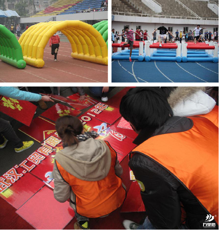 【比賽方法】比賽前,將所有拼圖打散,每個拼圖規(guī)格為2.5米X2米,每塊拼圖規(guī)格為0.5米X0.5米,每支隊伍有20塊拼圖,比賽開始前,所有選手站在起點后,每1男1女為一組,兩選手并肩站立,將相鄰的兩腿綁在一起,裁判發(fā)令后,第一組男女選手依次通過跨欄、彩虹門到達終點(全程30米),一人拿兩小塊拼圖,然后沿路返回起點(返回過程中不用經(jīng)過跨欄和彩虹門),與下一名選手接力,依次類推,當所有的選手將拼圖全部拿到起點后,選手在指定位置開始各自拼圖,在規(guī)定15分鐘內(nèi),按用時最少的順序排出名次,如果所有隊伍均未拼出完圖案,則由裁判按照與完成圖案的類似度排出名次。
