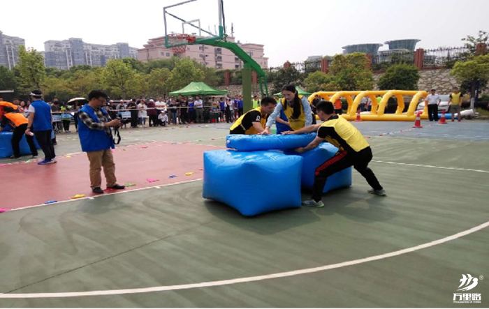 【比賽方法】比賽前,參賽隊(duì)伍分為2個(gè)小組,分別在起點(diǎn)和終點(diǎn)處。裁判發(fā)令后開始計(jì)時(shí),起點(diǎn)處1名女隊(duì)員坐在“橋”上,2 名男隊(duì)員負(fù)責(zé)移動(dòng)“橋”和“橋墩”到達(dá)終點(diǎn)處和終點(diǎn)隊(duì)員接力,終點(diǎn)隊(duì)員重復(fù)比賽回到起點(diǎn),人和道具全部過線計(jì)時(shí)結(jié)束。按用時(shí)長(zhǎng)短排名,時(shí)間越短排名越前。