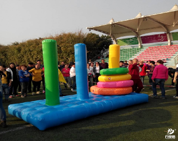 【比賽方法】有三根相鄰的柱子,每根柱子之間間隔1米,比賽開始前4名選手都在起點(diǎn)線后,裁判發(fā)令后,4名選手齊心協(xié)力把第一個(gè)柱子上的圈圈全部搬運(yùn)到最后一個(gè)柱子上面,比賽開始前,第一個(gè)柱子上由大到小的按順序疊放著充氣圓盤,4名選手需要充分配合,將疊放在第一個(gè)柱子上面的圓盤逐一移動(dòng),直至所有圓盤按順序疊放在第三個(gè)柱子上。按用時(shí)最短順序排出名次。