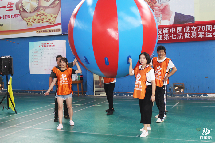 【比賽方法】比賽前,參賽隊(duì)員共同托起大球立于起跑線后。裁判發(fā)令后,參賽隊(duì)員共同托著大球沖向終點(diǎn)。比賽全程50米。中間不允許換人。以球體全部到達(dá)終點(diǎn)為準(zhǔn),按用時(shí)最短的順序排名。