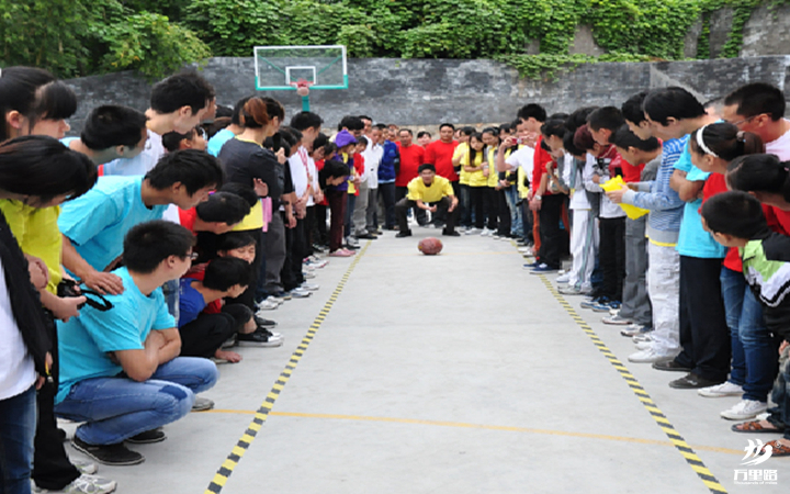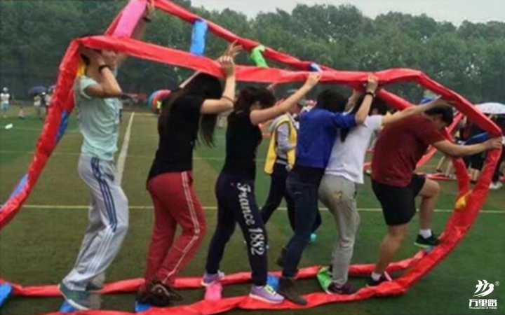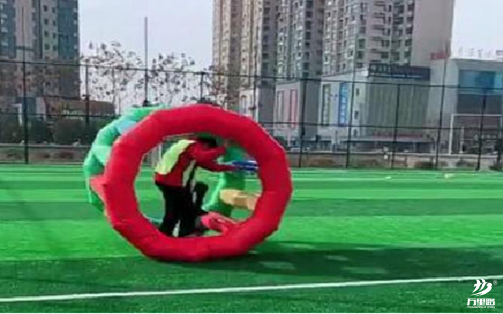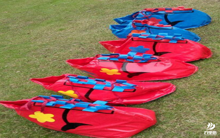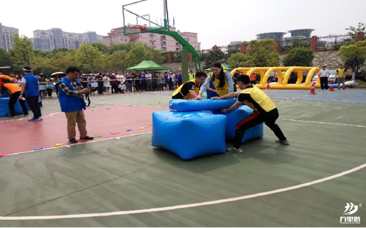 4人站在起點(diǎn)上,裁判發(fā)令后,4人齊心協(xié)力交替兩個(gè)充氣墊為自己鋪”橋“,腳不能著地。總共行進(jìn)30米結(jié)束比賽。