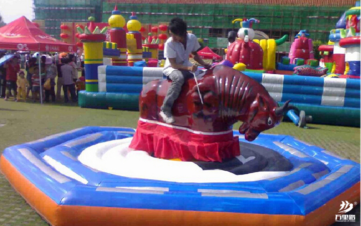 參賽隊(duì)員騎在牛上,準(zhǔn)備好后,牛身開始擺動(dòng),節(jié)奏由慢到快隨機(jī)變化。在規(guī)定的時(shí)間內(nèi)人不從牛背上掉下即為過關(guān)。