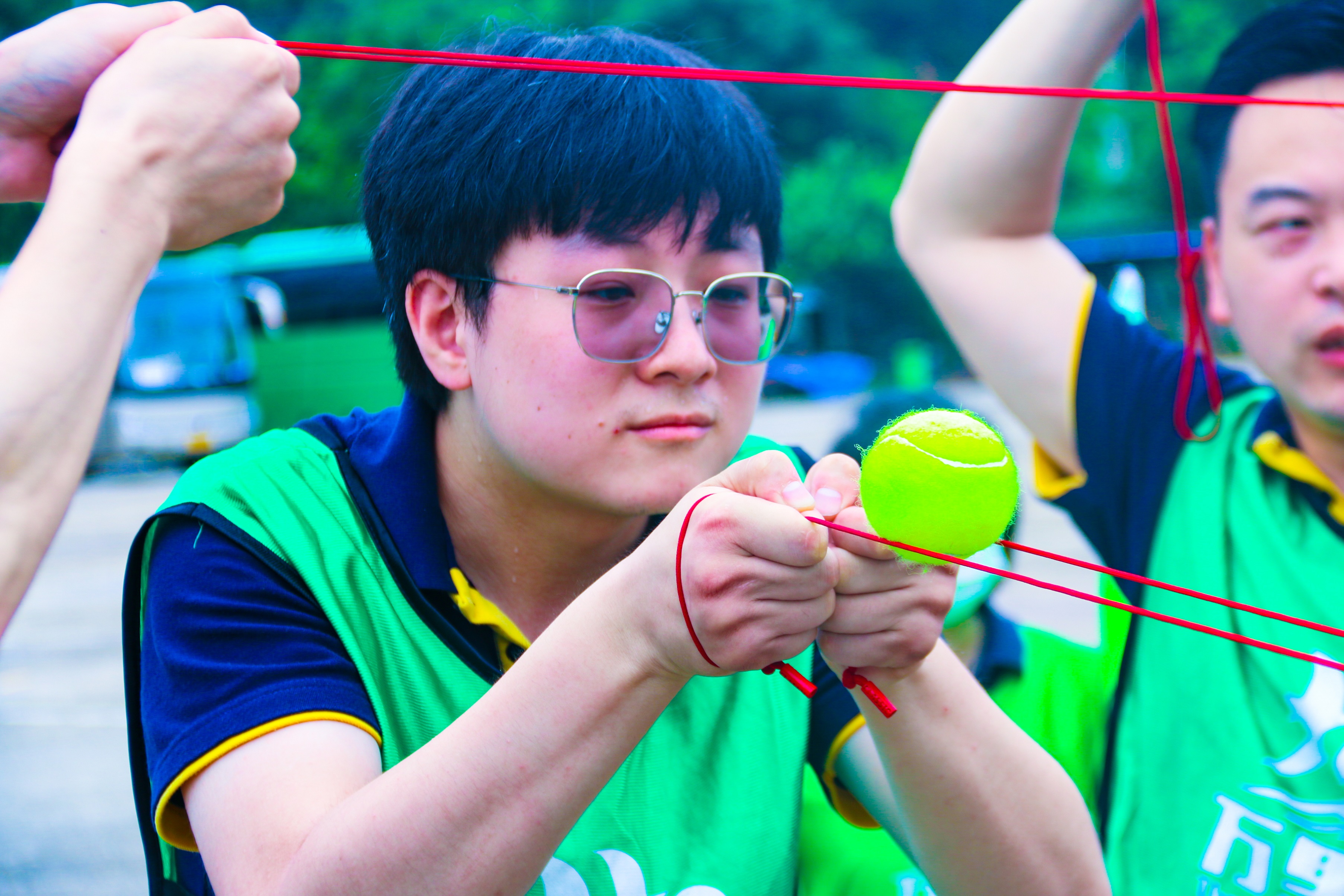 團隊成員手拉細線,通過配合協(xié)作