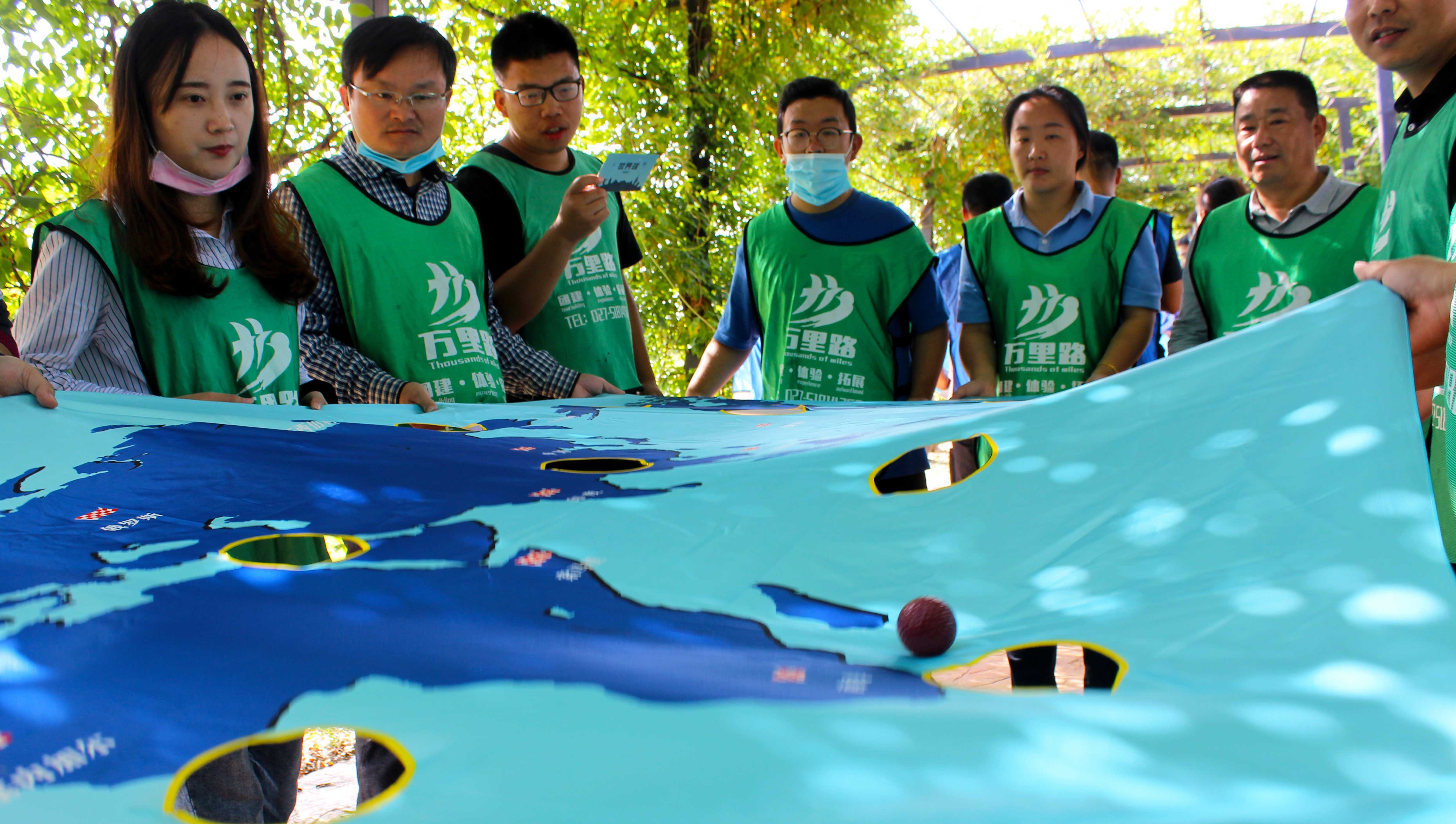 團隊成員手拉世界球地圖邊緣,通過全隊配合協(xié)作使在世界球按照一定規(guī)則路線,從起點到達終點, 網(wǎng)球行進過程中不允許掉落。