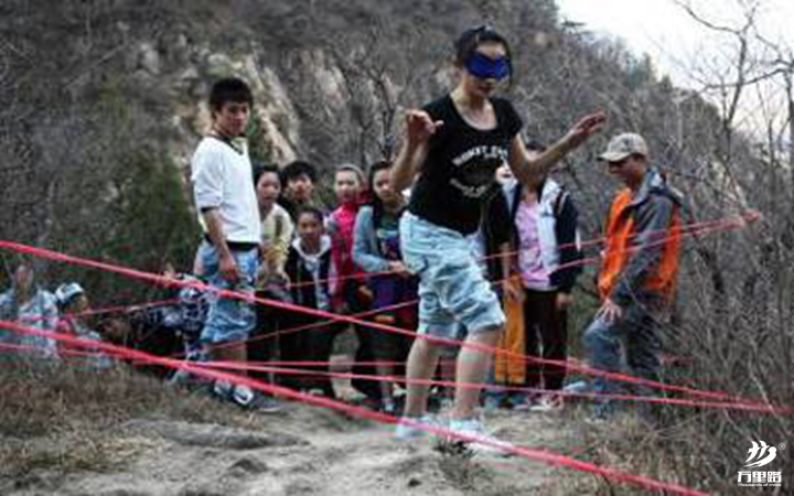 先將學(xué)員分成兩人一組我們每一組隊友都要通過這些紅外線(網(wǎng)線)從這一側(cè)安全地到達(dá)另一側(cè),通過的人要把眼睛蒙上,在同伴的指揮下通過,然后在交換角色進(jìn)行。