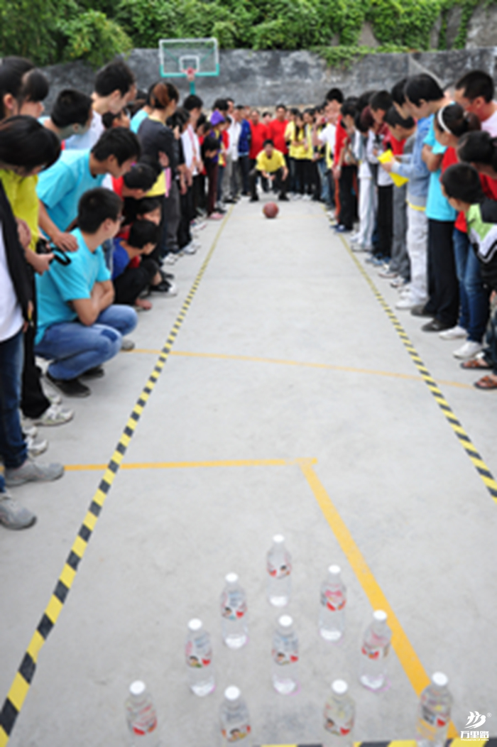 【比賽方法】隊(duì)員站在5米距離的發(fā)球線外,用腳踢球,滾擊裝滿水的礦泉水瓶。