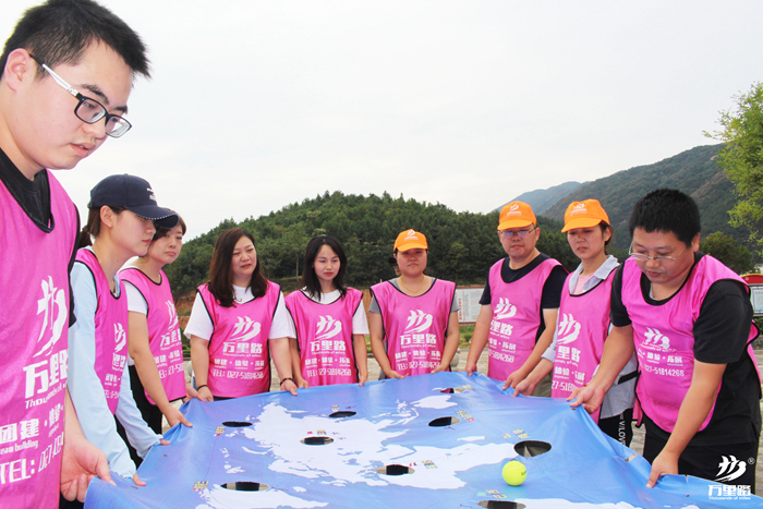團(tuán)隊(duì)成員手拉世界球地圖邊緣,通過全隊(duì)配合協(xié)作使在世界球按照一定規(guī)則路線,從起點(diǎn)到達(dá)終點(diǎn), 網(wǎng)球行進(jìn)過程中不允許掉落。
