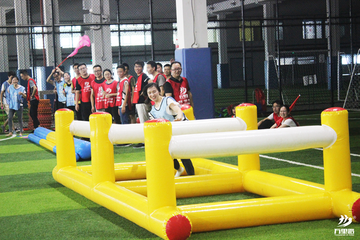 【比賽方法】比賽全程400米,每100內(nèi)有一個(gè)障礙,共四個(gè)障礙:第一個(gè)獨(dú)木橋,第二個(gè)跨欄,第三個(gè)鉆彩虹門,第四個(gè)鉆墊。比賽前,每組每個(gè)接力地點(diǎn)站有一名隊(duì)員,裁判發(fā)令后,第一名隊(duì)員手持接力棒,過獨(dú)木橋后與第二名隊(duì)友接力,第二名隊(duì)友跨欄后將接力棒交給第三名隊(duì)友接力,第三名隊(duì)友鉆彩虹門后與第四名隊(duì)友接力。第四名隊(duì)友鉆圈墊后跑到終點(diǎn)結(jié)束比賽。按用時(shí)最短的順序排名。
