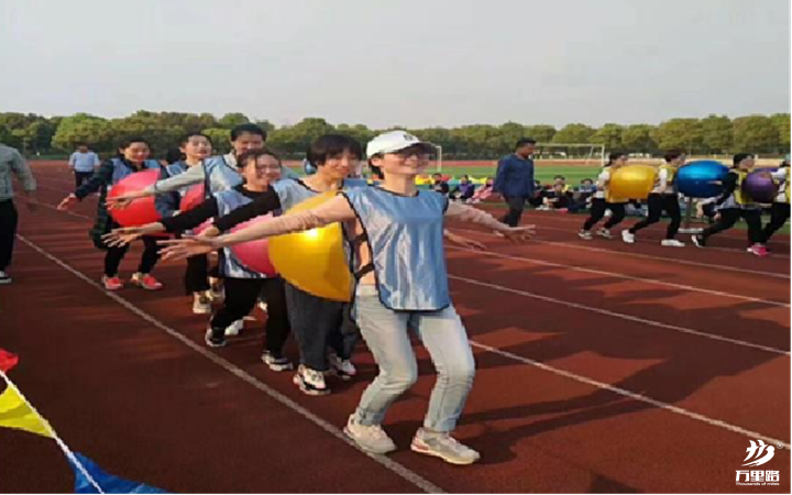 隊(duì)員相互之間夾著瑜伽球,排成長(zhǎng)隊(duì)一起到達(dá)終點(diǎn),用時(shí)最短的獲勝。