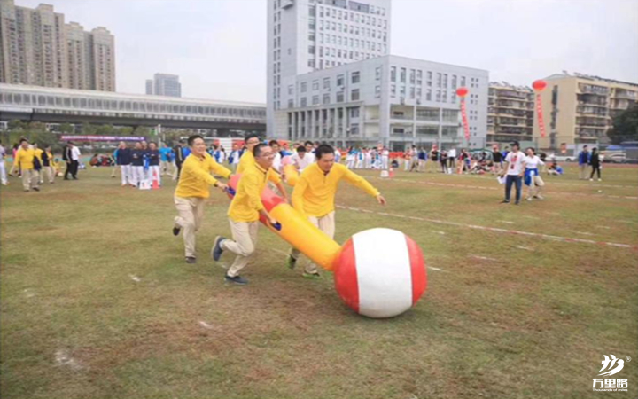 四人通過(guò)用充氣棍一起把球推到30米處的終點(diǎn),用時(shí)最短的隊(duì)獲勝。