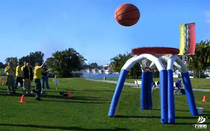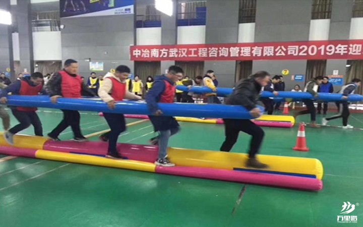 6人進(jìn)入充氣梯子,從起點(diǎn)到終點(diǎn),并通過(guò)獨(dú)木橋,不能掉下來(lái)。